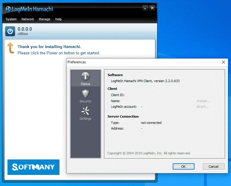 4. LogMeIn Hamachi ウィンドウを開き、「電源オン」ボタンをタップします。